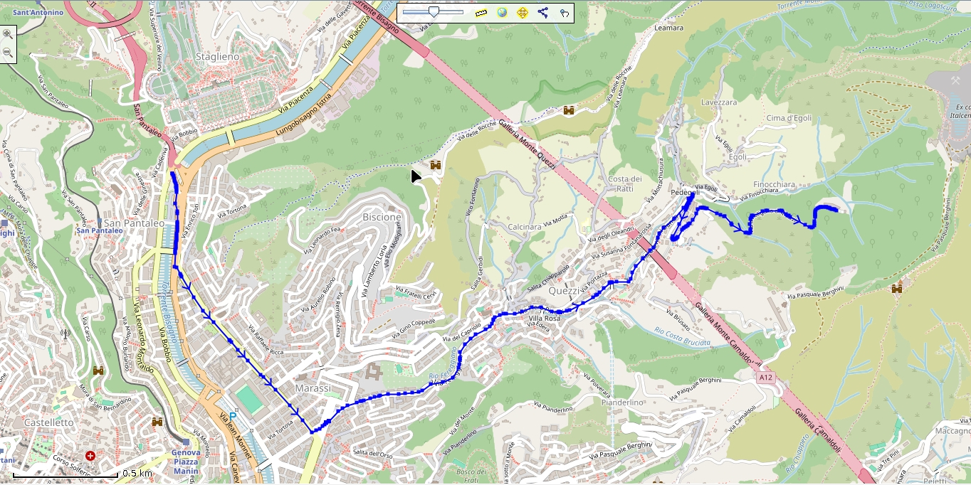 - Il gpx a partire dal casello di Genova Est è scaricabile qui (clic destro e poi "salva destinazione con nome"), ed il tracciato è nella figura sotto (cliccarla per ingrandire):